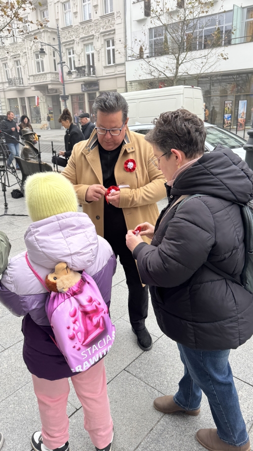 "Szanowni Państwo, jesteśmy dokładnie w przededniu rocznicy odzyskania przez Polskę niepodległości. Bardzo ważne święto, święto wszystkich obywateli, bez względu na to, czy są zwolennikami lewicy, prawicy, święto nas wszystkich. Dlatego dzisiaj z okazji tego święta będziemy rozdawać mieszkańcom Łodzi kotyliony, żeby jutro dumnie ten kotylion przyczepili sobie do kurtki, do marynarki, do swetra i dumnie pokazywali, że Polska jest niepodległym krajem". - mówił Tomasz Trela, Poseł Na Sejm RP.