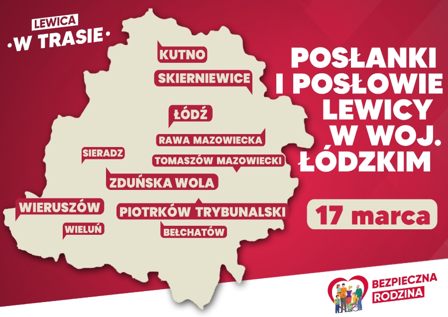Już 17 marca (piątek) parlamentarna trasa Lewicy odwiedzi województwo łódzkie! To doskonała okazja do spotkań i rozmów o programie, bieżących sprawach i problemach z naszymi posłankami i posłami. Zapraszamy i do zobaczenia. Poniżej dokładne adresy miejsc spotkań.