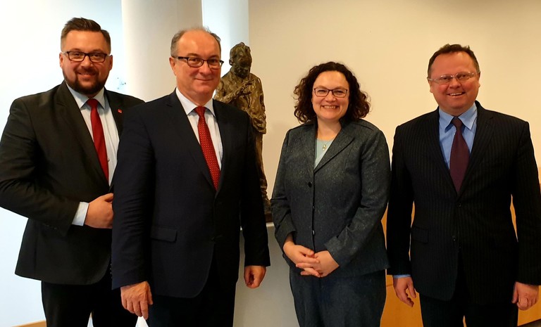 Przewodniczący Sojuszu Lewicy Demokratycznej Włodzimierz Czarzasty, sekretarz generalny Marcin Kulasek oraz wiceprzewodniczący ds. międzynarodowych Andrzej Szejna spotkali się w Berlinie z szefową SPD Andrea Nahles oraz ...